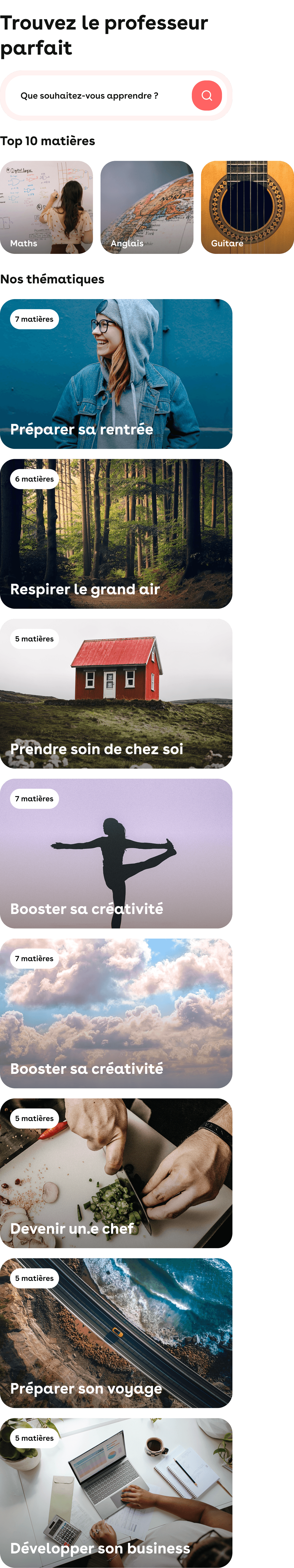 Recherche par thématique, localisation ou mode de cours pour trouver le professeur idéal.